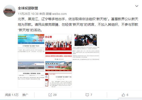 近日,中国反邪教“一网两微”、微博“公安部打四黑除四害”“全球反邪联盟”等发出警示,提醒民众“勿轻信‘新天地’的谎言,不加入其组织,不参与其活动。”