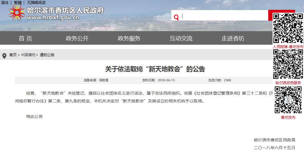 本溪市民政局2018年6月25日发布《关于依法取缔“新天地教会”的公告》称:经查,“新天地教会”未经登记,擅自以社会团体名义进行活动,属于非法社会组织。依据《社会团体登记管理条例》第三十二条和《取缔非法民间组织管理暂行办法》第二、第九条规定,本机关决定对“新天地教会”及其设立的相关机构予以取缔。